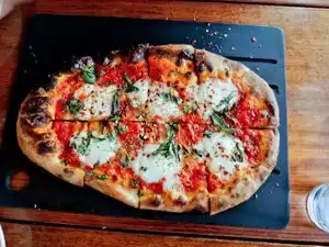 Actually quite good pizza. The wood fired crust is really what makes it. Toppings a bit naff: too much tomato sauce, and funny Parmesan(?). Would have given the pizzas a 3.5, but the wine was the worst we ever had by the glass. Really cheap and nasty. Spoilt the meal. Beware, very, very busy Sunday and Monday as limited dining options in the area those nights.