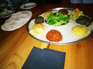 We have recently developed a taste for Ethiopian food and have tried it in London, Kenya and California. This is by far the best we have tasted. We had the vegetarian combo and lamb tibs. Worth noting that if you are celiac the Injera here is not 100% teff so there will be some . There was a live band on Sunday evening.