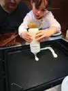 Got there a little before 10 and had a short wait before we were seated at a long "community" table. My nephew ordered the chocolate batter along with peanut butter and maple syrup. I shared the lemon poppy seed seasonal batter with my sister. Each serving of batter gives you about 5 decent size pancakes. If you are doing some designing you should have plenty to share and enjoy. Syrup is on the table so unless you need real maple syrup skip ordering as a topping. Batter, fixins" & toppings are all separate prices so see if you can share because they do give you a lot. Be prepared to help the little ones cook as you do this at the griddle in the middle of the table. Let them be creative but remind them they need to still flip their pancakes.