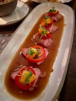 Downtown LA location for SoHo House. Came here for dinner and a DJ event afterwards. The vibes are chill and the food was tasty. The three of us split the spicy salami pizza, the pasta, crudo, eggplant dip with a balloony bread similar to the one at Bavel, truffle fries, and had drinks as well. They still served me a matcha latte for dinner which made me very happy. Loved the eggplant dip and the pizza was on point as always. We left dinner feeling stuffed and satisfied. Our waiter was nice and we enjoyed a leisurely meal. There’s a rooftop with a pool and a pretty view of the skyline. The art in the lounge was really cool. Valet parking available.