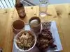 Simple decor, a few individual tables along with longer ones, like picnic tables. The cuisine has tones from Laos, not the standard Thai found across this country. For example Red Ants are in season (no joke) and they were offered on a salad. Only live once, go for it. It was fantastic and in some regards great when sampled side by side with the Papaya Salad with salted eggs. For main course, personally not a Fried Chicken fan but this stiff was heavenly. Wow. Tender, crunchy and full of flavor. The Grilled Beef Skewers were simple and tasty. The Fried Noodles; aka Pad Thai were great; simple filling and tasty. Tried to up sell us but this was plenty of food. Full bar. Limited wine list; South African wine was good and a value proposition