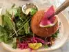 Number of flowers hanging from the ceiling and walls--over the top. Annoying scent from the candles on the tables, which we asked the wait staff to extinguish--overbearing. We found the restaurant too noisy for us to have a conversation. The food was plated beautifully but, again, over the top colorfully. Food was tasty enough but nothing special. I ordered the cauliflower veggie burger with greens on the side.