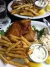 This has an easy going comfortable no pretenses ambiance. I bet it's great in the evening as a place to sit at the bar. We stopped by on a whim needing to get some lunch. I had no plans for anything but a salad! Ha best laid plans....both my husband and I were swayed by the waitress to order the Fish and Chips. They were authentic and fresh served with Tartar Sauce and Malt Vinegar. You get 2 large fillets, and I was so full I couldn't eat my fries, so that's a lot of fish. Someone in an earlier review said they're greasy. That's true, but just a little and that's because they're authentic and they were served piping hot. They were worth a little grease! I recommend grabbing a table next to one of the front open windows, and watch the world go by. As always, photos accompany my reviews!