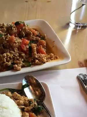 We were walking back to our hotel, cold and hungry, and happened to see this restaurant. At 2:00pm on a weekday, there were still people in it, and how can you go wrong with Thai food, but then again you never know and I didn't check with my friends who post on TripAdvisor. The gods were definitely watching over us, because we both ordered yummy meals, huge portions. Rice is extra, but you don't need it.... except the sauces are amazing. The meals were served very hot, and they had the right amount of spice for a 'one pepper'. I ordered the ginger chicken and my husband ordered minced chicken with basil. The stir fried veggies we're done perfectly.