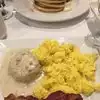 Honestly the food was fine. It wasn't amazing but you could go anywhere & find something similar. It is quite expensive for breakfast. We were a family of four that had: three orders of pancakes with sausage or bacon & one breakfast with eggs, turkey sausage & 1 biscuit with gravy. We had a milk, juice, coffee & a coke. It was $109 after tip. And the 18% gratuity is automatically added to the bill. So service doesn't necessarily matter. Our server forgot our drinks initially. We asked for a couple of things after food was served & they were never brought. I just think $109 is quite astronomical for breakfast that tastes fine, but isn't amazing. The real MVP of this place is the guy who serves the food walking down staircases repeatedly with a big tray & never dropped anything.