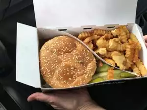 After driving past this place for nearly three weeks, we finally caved in and visited. There wasn't an empty parking bay in sight when we came and yet the service was fast and the food was delicious. My only complaint is that the way they packed the hot dog and chips into the box made it pretty hard to actually get at the hot dog.
