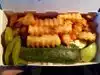 Take one small box, cram a poppy seed bun in it, drop in a super dawg,(pure beef) add mustard, piccalilli ( or not), onion and a full size dill spear on top, with a pepper too; now bury it in French fries, not just any fries, but their Superfries! That's a SuperDawg. Ketchup is forbidden...no dawg loving person would even think of asking for Ketchup! This Drive In establishment specializes in quick but good eats. Old fashioned, drive in with order boxes in the heart of old Chicago. Serving dawgs since 1948, it's a Chicago Icon that many try to mimic...don't be fooled, be sure to search out the original and by all means try a SuperDawg! It's a hot dog (oops...a SuperDawg) folks....just a really fun place to get one!