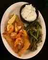 The restaurant was crowded, and the wait was going to be 45 minutes, but we really only waited 20 minutes. The seating inside to wait was a joke so we sat outside and people watched. The music was great both inside & outside. We both ordered shrimp and catfish platter, which comes with 2 sides. I ordered mac n cheese, vegetarian greens and an extra side of yams. My husband ordered mac n cheese, and yams. The cornbread was BOMB.COM lol. Sweet with a touch of cinnamon. The greens tasted like the Sylvia's vegetatian greens being sold in chain grocery stores. They didn't have any umph to them. The yams were great (I didn't get mine, so hubby shared his. Probably universe saying I was being to greedy lol) The fish was ok. It wasn't seasoned hot sauce made it decent. The shrimp were really good.