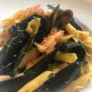 I had the pasta (made in-house)with seafood (shrimp and mussels), another had risotto and another had the vegetarian lasagna which was the most flavorful. We also shared the cheese stuffed squash blossoms ( very good), watermelon gazpacho which was very tasty and refreshing on a hot day. Service was excellent!