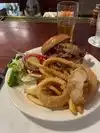 Stopped in for lunch and was impressed with the old school interior with its brass and oak Bar and private dining booths. We had the Bison Burger with Onion Rings and a Black and Blue Steak Salad. The burger was very good and the onion rings were hot, huge and delicious. My salad was a little less impressive but still good. I would have like the steak to be chopped as it was hard to cut in the bowl and my onion straws were not very warm. We were sat right across from the open kitchen which was interesting but also noisy. We would definitely return.