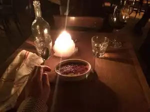 The quaint restaurant was lit by candles. There were shared tables with barstools and then a few private tables. We ate dinner around 7:30pm and despite our reservation being lost, they seated us immediately. Everyone's food was amahzing. The staff were great and we were cozy in the dim lighting.