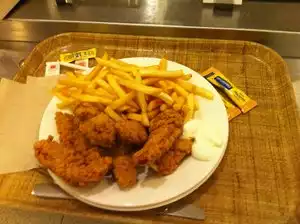 Why is it that cafeteria food is so bad? My wife had the chicken fingers. Incredibly touch to chew and hard to describe how dry they were. I had an average burger. The fries were cold. Sigh. Our low expectations were matched.