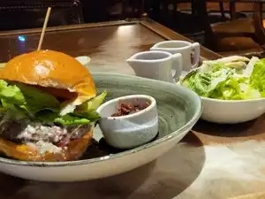 Go just to see the Interior Design. Beautiful western sculptures, artifacts, artwork, stained glass, leather seating, mahogany wood, just lovely. We didn't try any food but had drinks and nice service. Lively crowd and lots of interesting places to sit.