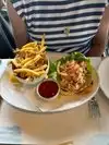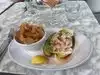 Went to The Fulton for lunch with my wife during a weekend anniversary trip to NYC. We sat outside in covered space and soaked in a beautiful late summer midday. The restaurant perfectly suits the vibe. It was full but relaxed. The Brooklyn bridge sits off the the left, making for a beautiful backdrop. Had it existed pre-COVID, it would have been filmed constantly for TV show and movie lunch scenes. The staff was friendly, knowledgeable and attentive without hovering. We started with a seafood plateau of sashimi, shrimp and oysters. Everything was perfectly fresh and chilled, and the accompanying sauces were spot on. From there, I went with a fried swordfish sandwich with bacon and remoulade. It was delicious, as was the bite I had of my wife’s ( perfectly cooked) lobster roll. Even the house potato chips were melt in your mouth thin and crisp with not too much salt. We added a side of exceptional fries. I had a sweet and sour Cherry tart for dessert. If not as over the top memorable as the other courses, it was still an excellent finish to the lunch. I can’t wait to get back.