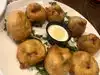 Try the Midnight Mule! Made with Texas Moonshine. We also got their sampler: fried green tomatoes, fried pickles and deviled eggs.