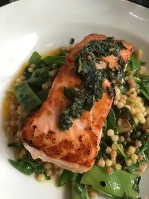 We had dinner here recently and it is a busy place , even on a Monday night . We were seated incorrectly and asked to move , which was no big deal at all , and they offered a free appetizer for the inconvenience which was very nice of the manager . We had the hummus appetizer , and having been to a Turkish place recently , the hummus did not measure up to that , but again it was complimentary and the bread brought to the table was very good . The main courses were the salmon which my wife enjoyed , and I absolutely loved the Ribeye . It was cooked a perfect medium and was the best one I have had for a while . One odd thing was it came with either fresh greens , fries or mashed potatoes . They don’t have baked potatoes which go perfectly with a good steak . Hard to believe a pub / restaurant does not offer baked potatoes . Lastly , I finished up with an espresso which was really bad . Just get regular coffee if you are used to espresso from Italian places . All in all a good place for dinner , especially for the ribeye