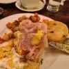 Stopped in without a reservation as a 6. We could have waited 30+ minutes for a table but chose to be seated right away at a hightop. Our waitress was pleasant and took drink orders. In the interim, a man came in to panhandle and was getting loud and confrontational. Management stepped in and used a calming approach and finally coxed him to leave. They apologized profusely and comped use some cookies and pancakes. We had the eggs Benedict, omelets and BLT on croissants. Everything was delicious, hot and plentiful. We welcome a chance to return sans the entertainment. Enjoy!