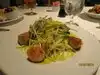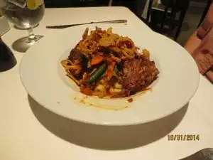 They serve excellent chicken broth to start (free). We had sensational spring rolls - tasty and beautifully presented, low calorie. Steak salad and steak main course were very good. The lemon sole main was over salted. Espresso was as it should be.