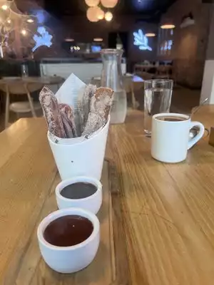 I walked in around 1:30 pm on a regular Thursday afternoon. It was pretty empty, only one other table had a customer. The service was good, friendly but not annoying. I tried Baja salad, and it was OK but nothing special. The avocado toast was good and came with a much better salad. Sadly, they did not have pretzels and they no longer serve chili dogs. Wild Mushroom Hash was very good and had a great balance of mushrooms and eggplant. I got a Paloma and it was excellent. I also got gluten free churros with chocolate sauce for dessert, and they were very good. Would return for the churros. :)
