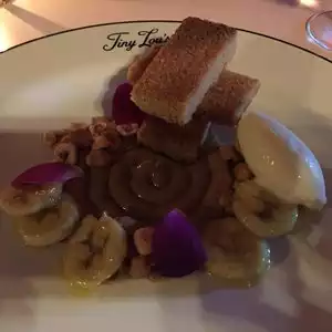 We initially came to Tiny Lou's for a drink upstairs with plans to dine elsewhere. We ended up staying for dinner and it was such a good decision! Absolutely start with the bread service - it's delicious. Scallops - A+, burger - A+, onion soup, A+. I forget the dessert we had but it was like a riff on banana pudding but with a little chocolate and hazelnut and it was amazing. Wine list is great and our server was incredibly helpful in selecting a nice bottle. This restaurant was a real treat and while it was splurge compared to our original plans, it was a great experience and highly recommended for a nice dinner out.