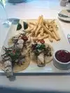 Lovely view and comfortable sitting in glassed area where view was great and protected from sun. Service was attentive. Crab cakes good, but had excess filler and mayo—presentation nice. Swordfish tacos OK, but I am always disappointed in the messiness of tacos—-not for fine dining. Fish and chips—fish a bit soggy, but fries excellent. This would not be a restaurant for someone who does not like fish. Very busy. I wonder if this would be assume if this restaurant were located in a less busy location. It was good, but I would likely not go back.