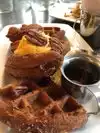 This was my third visit to this location. It was super busy on a Saturday for lunch. I like the ambience but prefer the other location in the suburbs for food , service and ambience . The fries were over spiced ... the steak salad was good. The waffle was too good!