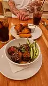 Food was surprisingly good. Pasta with ragu, pizza , crispy pork belly and sashimi very good. Service fast and pleasant. Would eat here again