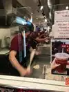 The menu is on the wall as you walk in; go to the cashier and tell him what you'd like. Folks in front of us had questions about the menu, and they were helped patiently and with lots of information. Don't forget to buy your drinks when you order your food. The signs are clear; it won't taste as good "to go," so eat in. After you've paid, you'll get a ticket with a number. Then line up to wait for your food (sending someone in your party to grab a stool to sit on). There's also extra seating upstairs. Hold on to your receipt - it has the code that allows you to enter the restroom! The "normal" spiciness was pretty spicy, so if you're not sure you can enjoy that, go for "mild." Also, the noodles are long and difficult to cut and covered in sauce of one type or another -- all of which is to say, don't wear a white shirt! Or be a lot more careful (less sloppy) than I was! Delicious fast food.