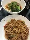 Excellent stir fry noodles (fettucini and chicken). Noodles have lots of texture and great taste. Beef noodle soup very good, sushi sampler was so-so appetizer. Plenty left over for second meal at home.