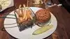 We had the chicken and steak cheesesteaks with fries and onion rings. Both sandwiches were very good with lots of meat and cheese. The fries and onion rings were very good also. Portion sizes are very large--most people could split and order. Servers were great--very attentive and quick to return with requests (ketchup). The table has those small electronic tablets on the table for special requests and paying the bill. Tables are spaced far apart and there are sports on all the TVs mounted around the room but the restaurant is very loud. This is not a quiet place to catch up with friends but it was very good for a bite close to the hotel.