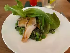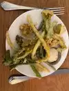 Zimmi's was the second new French West Village restaurant I tried during this visit to NYC, the other was Le Chene. It opened in December last year. It's a petite corner spot with a decent-sized menu which seems to change fairly often and is certainly more upscale than tradition French bistro fare. I ordered 4 dishes: 1) Legumes frits. Fresh veggies fried in a light and crispy tempura-like batter served with an anchovy-based aioli. 2) Soupe de celeri. Chilled celery soup, creamy but non-dairy, topped with creme fraiche. 3) Poulet printanier. Chicken with spring vegetables and lettuce. 4) Brown sugar meringue roulade with cherries and almond. I loved everything. The soup was perhaps the most traditional dish, and my least favourite, but still very good. If I lived nearby and had a large dining-out budget, I'd be here weekly.